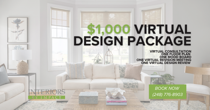 The Virtual Design Package by Interiors by Impact brings the expertise of our design team directly to you—no matter where you are. This complete virtual experience includes a personalized consultation, a detailed floor plan, a custom mood board, and a curated selection of furniture and décor for one room up to 250 sq. ft., all tailored to your style. You’ll also receive a virtual design review and one revision meeting to perfect every detail. Designed for convenience and creativity, this package offers the same thoughtful process and professional guidance our clients love—now available for a limited-time price of $1,000 (regularly $1,500).